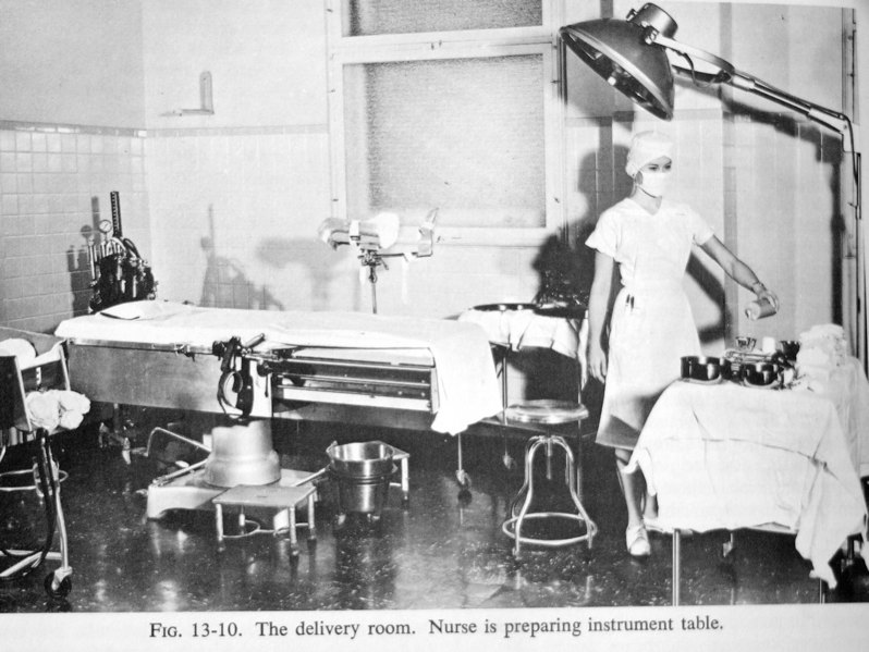 During the surgical procedures of ‘delivery’, women were in OR-type delivery rooms, unconscious and in stirrups. Hospital rules for strict surgical sterility allowed only hospital personnel who were in hospital scrubs with a scrub hat and mask be permitted to enter the restricted environment of the delivery room, so husbands could never be present at the birth of their baby.